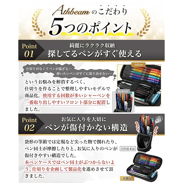 【こだわり】様々なメーカーから ペンケース が販売されていますが、Athbeamの ペンケース は”こだわり”が一味違います。文具製品を取り扱っている10社以上の工場からサンプルを取り寄せ、「 大容量 ×ペンを傷つけない構造」を一緒に試行錯誤していただけた1社に絞って発注を行なっています。