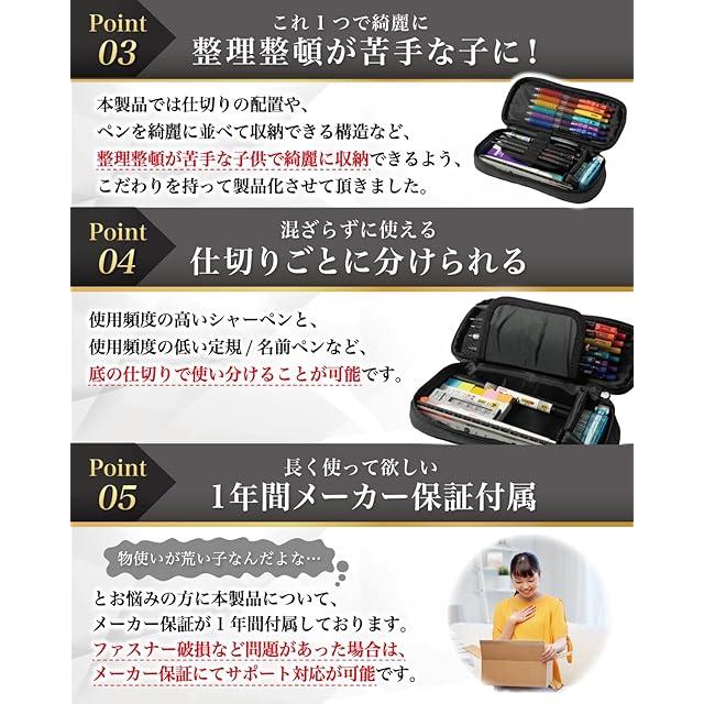 【製品の長期メーカー】 Athbeam ペンケース は品質にこだわり、工場と交渉を行なって素材選定から進めています。出荷前の検品などは十分に行なっておりますが、稀に輸送中に破損や汚れの付着が発生してしまうケースがあります。不具合などが発生してしまった場合でも、製品には長期を付属させていただいておりますので、すぐに交換品の手配をいたします。また本製品には使いやすさや快適さを実感していただくことを最優先に考え、「2週間使ってもうまく文具を収納できなかった」という場合に、”開封後”でも”使用済み”でも全額の返金を付属させていただいております。