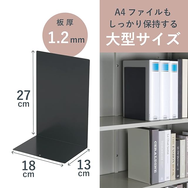デスクの端まで使用できる大型サイズのL型ブックエンドです。1.2mm の板厚は剛性が高く分厚いファイルや大きな書籍などをしっかり支えます。