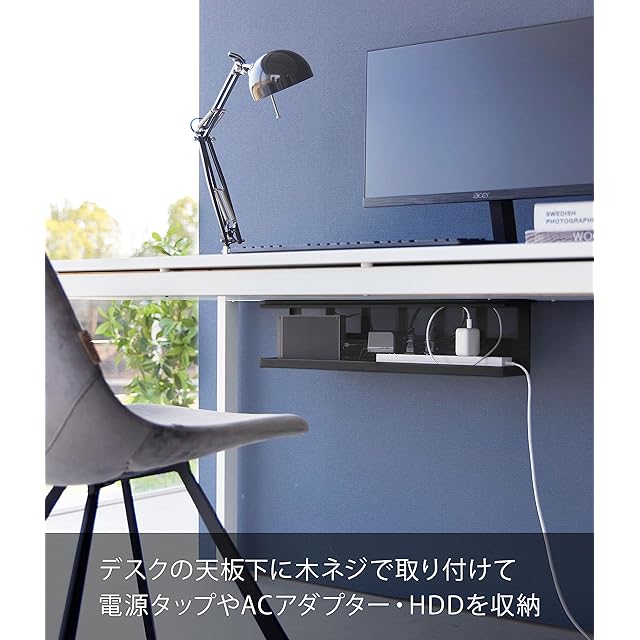 デスクの天板下に木ネジで取り付けて電源タップやACアダプター・ハードディスクを収納。カバーを付けて見た目がスッキリ!