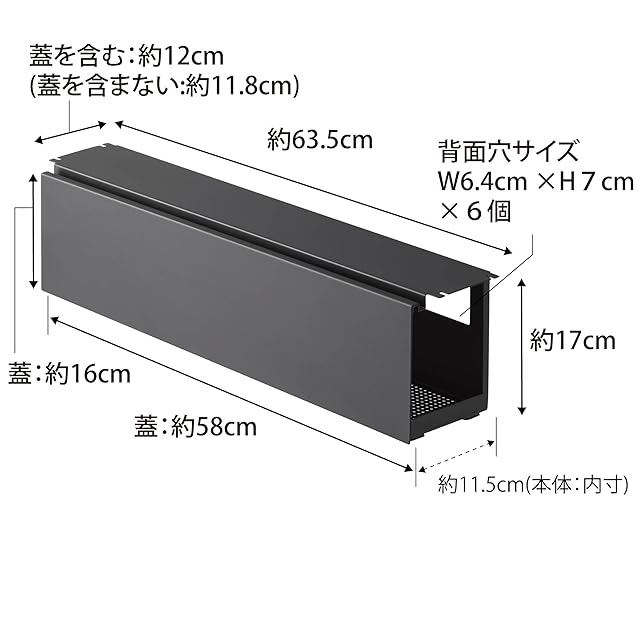 商品サイズ:約W63.5×D12×H17cm(蓋含む) ・内寸:収納部:約W57.8×D11.5×H16.8cm コード抜け穴:約W6.4×H7cm(1つあたり)