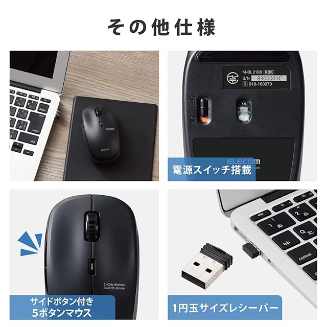ネットの閲覧などの操作に便利な「進む」・「戻る」ボタンが付いた5ボタン静音ワイヤレスBlueLEDマウス。