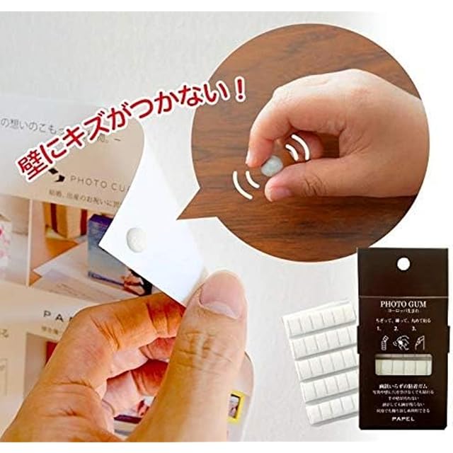使用方法:適量をちぎって、よく練ります。写真やポスターなどの掲示物の四隅につけて壁に貼ります。はがすときは端から丸めるようにゆっくり転がしながら外すと跡に残りません。取り残しが出た場合は他のフォトガムを上から押し付け、転着させるとりやすくなります。