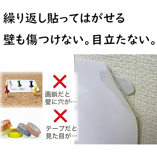 画鋲止めのように壁を傷つけません。掲示物を傷付けずしっかり固定できます。くり返し貼ってきれいにはがせる粘着剤です。穴をふさぐパテ代わりにもなり、滑り止めや転倒防止にも。ポスターの貼り付け、メモの仮止め、小物の固定などに便利です。
