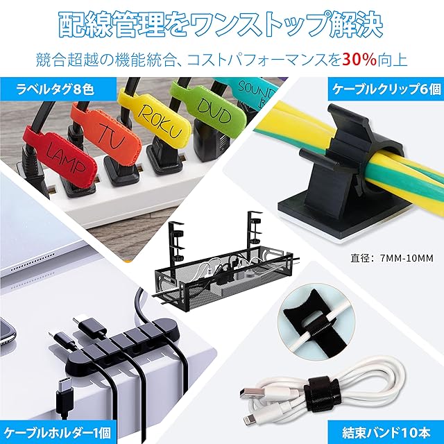 【競合他社を凌ぐ機能統合】他社では別売りとなっている6穴式ケーブルホルダー1個、ケーブルクリップ6個とラベルタグ8色を標準装備。コストパフォーマンスを30%向上させています。さらに、ケーブル結束バンド10本を同梱しており、太いACアダプターや巻き癖の強いケーブルも簡単に結束できます。電源コード・LANケーブルの分類から固定まで、ケーブルマネジメントをワンストップで解決。従来の「ケーブルボックス」ではできなかった精密な配線管理が可能になります。