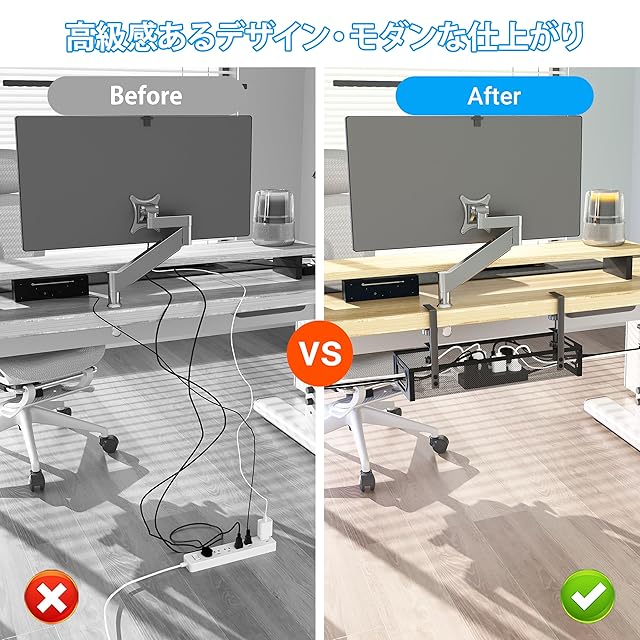 【7kg耐荷重×3分間で設置!】企業向けに耐久性を追求。 丈夫な高炭素鋼フレームに二重ラッカー塗装を施し、防水性と錆防止性能を高めています。7kgに耐えるビジネスグレード品質、耐摩耗性のシリコンパッドを標準装備して安定性を高めました。1年間の付きで、法人向けの購入にも安心です。クランプ式固定でデスク天板(厚さ1~5cm 対応)を挟み込み、底部のハンドルを回すだけで強固に固定。女性の方でも簡単にセットでき、家具に傷を付ける心配はありません。テレビ裏 収納・テーブル下収納・キャビネット下・コード まとめる・コンセント隠しなど、あらゆる場面で活躍します。