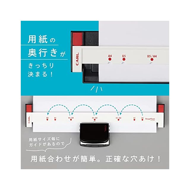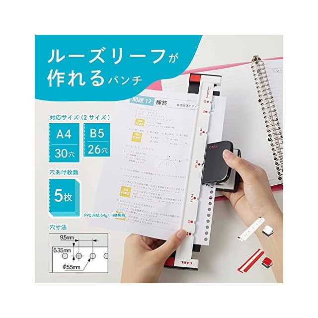 【対応サイズ】A5/20穴,B6/18穴(不要穴含まず)【穿孔枚数】5枚【穴径】5.5mm 【穴間隔】9.5mm 【穴奥行】3.6mm