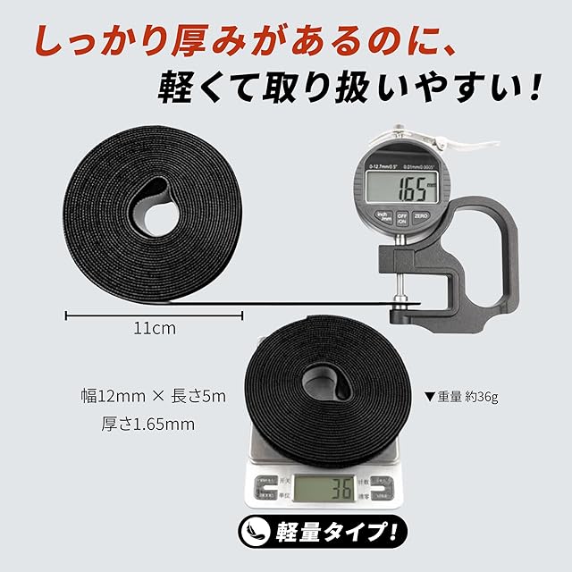 ★【強力な面ファスナーでしっかり固定】 トベルクロ式を採用しており、細かく高密度なフックとループがしっかり噛み合う構造になっています。 そのため、軽いケーブルだけでなく、太めの電源コードや複数の配線を束ねる用途でも安定した結束力を発揮します。一度巻いて留めるだけで、ズレたりほどけたりしにくく、長時間の固定にも対応。 さらに、面ファスナー特有の「巻き直し」や「再調整」も簡単なので、必要に応じて緩めたり締め直したりも自在。
