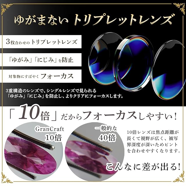 【プロ鑑定士と共同開発】 ルーペ 拡大鏡 GranCraft 鑑定 観察用 10倍 宝石 鉱石 ジュエリールーペ 【鑑定最適倍率x3重構造トリプレットレンズ】 【A9レンズ採用xリベット留めでゆるまない】【プロ鑑定士 解説の取扱説明書付き】 (マットブラック, 18mm)