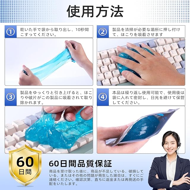 【抗菌・环保】ジェルクリーナーはちぎれにくく、ベタつかず、繰り返し使えます。特別に抗菌分子を配合し、ほこりを吸着するだけでなく、細菌の繁殖も抑制します。さらに、95%生分解性の環境に優しい成分で、さわやかなほぼ無臭のブルーベリーの香りが広がります。