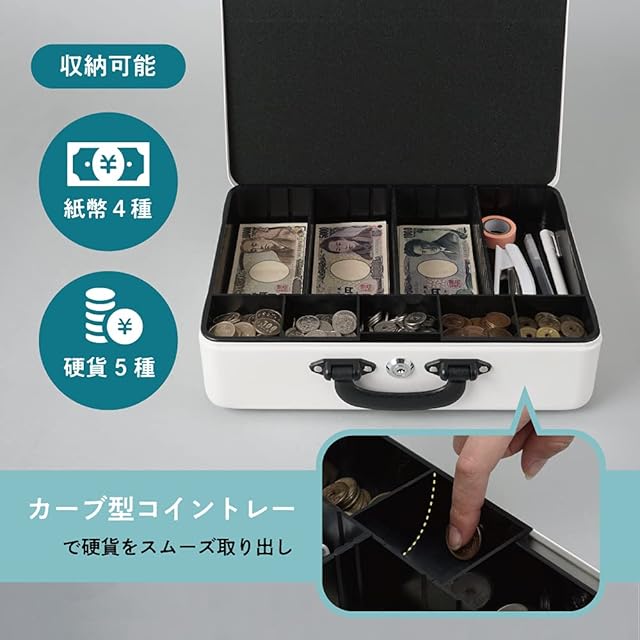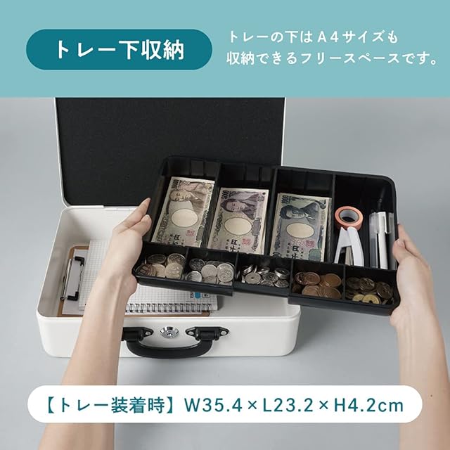 【主な機能】ダイヤルロック機能、コインカウンター付きトレー、A5書類収納可能、鍵2個付き(シリンダー錠)