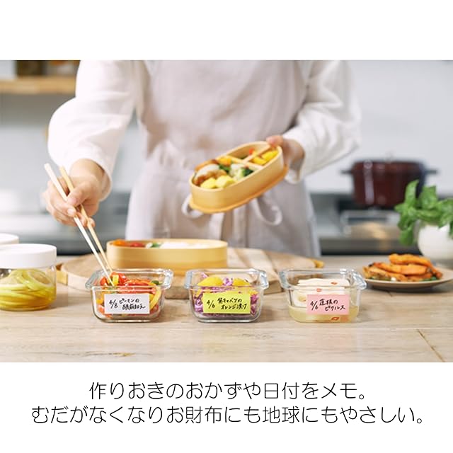 【貼って、はがせるテープ】貼り直しができるテープなので、封止めや、つくりおき・調味料のラベルとして活躍します。テープの上に油性ペンで日付や賞味期限を記入しておけば、ご家庭の「食品ロス」の削減に繋がります。
