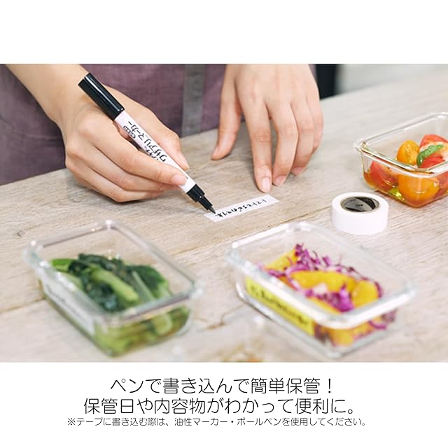 【食品ロスの削減に】テープの上に油性ペンで文字が書けます。日付や賞味期限を記入しておけば、ご家庭の「食品ロス」の削減に繋がります。