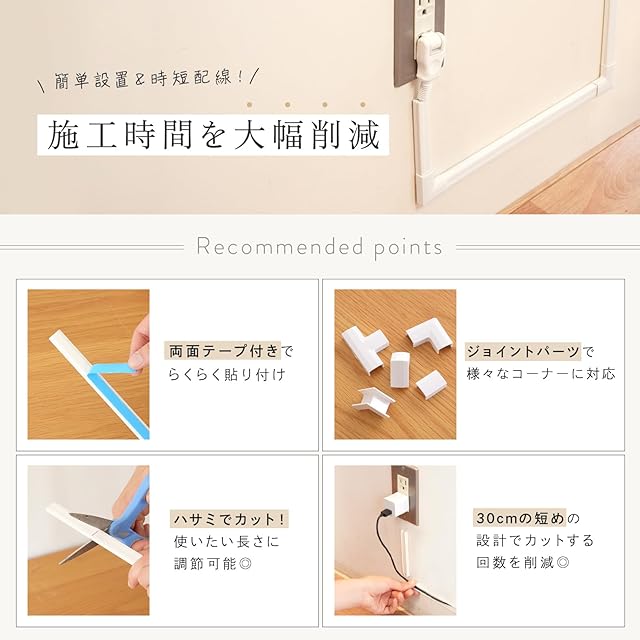 【簡単取り付け・両面テープ貼付済み】atRise配線カバーは、両面テープがあらかじめ貼付されているため、面倒な道具や作業が不要です。取り付け場所にしっかりと固定でき、すぐに配線を隠すことができます。手間をかけずに美しい仕上がりを実現します。※加工上の理由で製品や梱包箱に白い粉末が付着している場合がございますが、製品に問題はございません。濡れた雑巾等で拭けば綺麗にふき取り可能です。ご了承ください。
