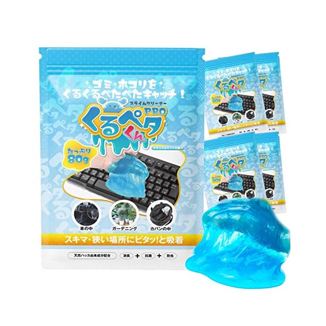 商品名:くるペタ君 年末 大掃除 簡単お掃除スライム型クリーナー べたつかずにホコリを吸着 狭いキーボードや車のすき間汚れをスッキリお掃除 除菌効果 80g×5袋