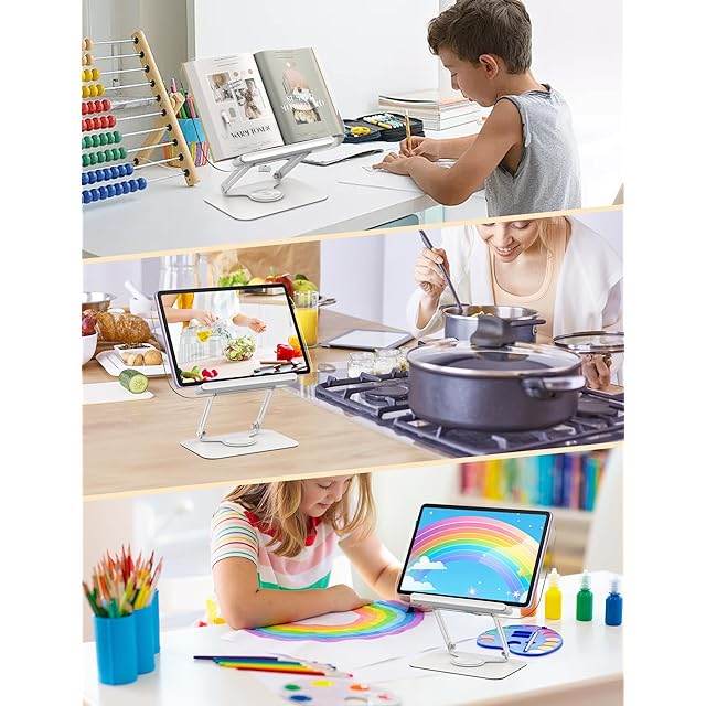 【360度回転可能】卓上スタンドは台座部分が回転するので、見やすい向きに簡単に調整できます。タブレットスタンドやPCスタンドとして使う時、回転させて相手の見やすい向きに画面を共有できるので、オフィスでの資料の表示や説明、会議やプレゼンテーション、在宅デスク作業、オンライン教育などに最適です
