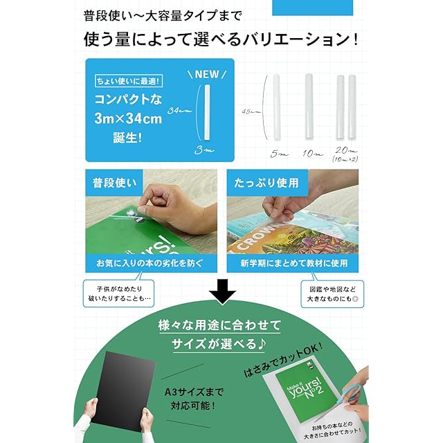 【おすすめ使用例】3m:すこしの本をブッカー保護したい、ちょい使い向け。5m:お気に入りの雑誌や本など数冊の本を保護したい人向け(5mサイズで、A4のみだと15冊、A3のみだと10冊使用できます※あくまで目安となります)。10m:保護したい本を多く所有している人、お子様の制作物や絵など本以外にも使用したい人向け。20m(10m×2本) :新学期の教科書をまとめて保護、自宅にある漫画、小説や大切な本をまとめて保護したい人向け。
