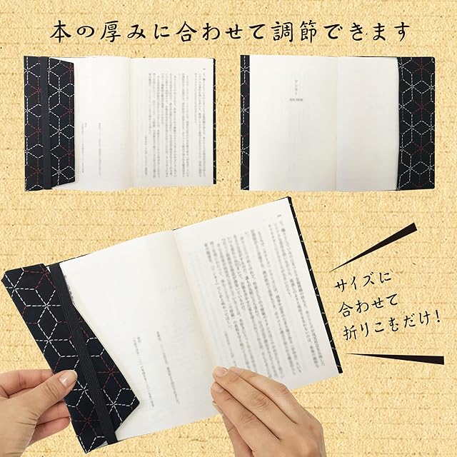 【調整可能なブックカバー】片面を縫い止めしていないので、本の厚みに合わせて楽々収納できる調整可能なブックカバーです。内側にゴムを付けているので本の表紙がめくれてしまう煩わしい思いをせず読書を楽しめます。