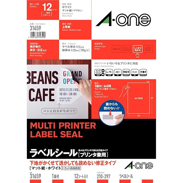 エーワン ラベルシール 透かしても読めない修正タイプ A4 ノーカット 12シート 31659