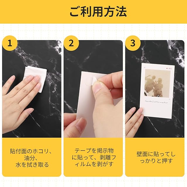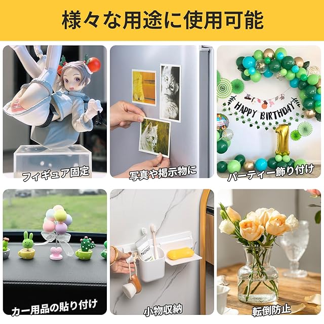 【幅広い用途】ポスターを貼る、ダイニングテーブル用マットを固定、卓上の小物を固定、スマホリング接着、ラグマットのズレ防止、花瓶やペンスタンドの固定。クリスマス、ハロウィーン、結婚式の装飾、オフィス、教室、学校に使う。