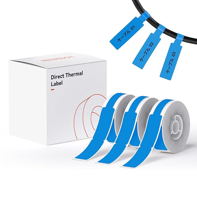 NIIMBOT ケーブルラベルシール 【3ロール】 D110/D11/D101ラベルメーカー対応 JADENS対応 純正感熱ロール紙 感熱ラベルプリンター 印刷用紙 強粘着 耐水 宛名印刷 整理 保管 値札 65枚 シート/ロール、12.5x109mm (青)