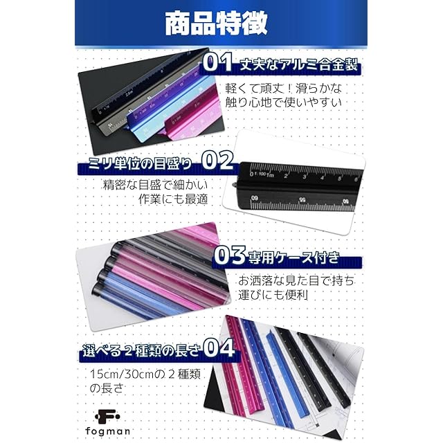【商品特徴】 丈夫なアルミ合金製:軽くて頑丈!滑らかな触り心地で使いやすい ミリ単位の目盛り:精密な目盛で細かい作業にも最適 専用ケース付き:お洒落な見た目で持ち運びにも便利 選べる2種類の長さ:15cm/30cmの2種類の長さ