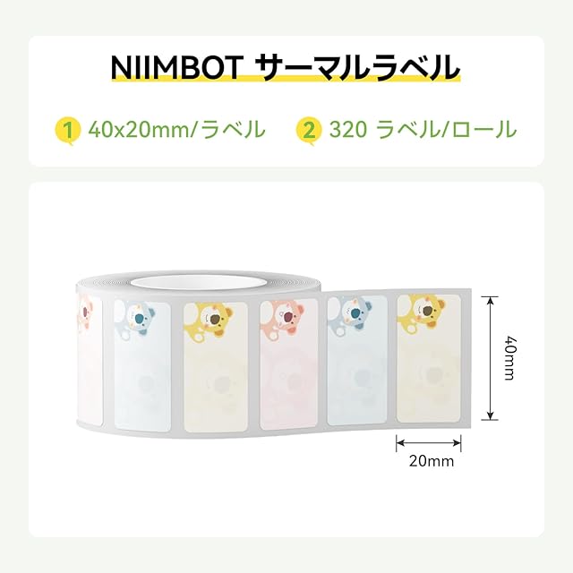 NIIMBOT ラベルメーカー本物のテープ(40 x 20 mm)プリンターステッカーペーパーB1/B21ラベルメーカーの自己粘着 320枚入り/巻 (かわいいクマ)