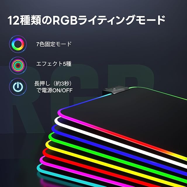 12種RGBモード&メモリ機能:スタティック7色+エフェクト5種、合計12種類のライティングモードを搭載し、着脱式ケーブル&ワンタッチ切替ボタン付き、ライティング効果を簡単に切り替え可能です。最後に使用したライティング設定を自動で記憶。毎回設定し直す手間がなく、すぐにお気に入りのエフェクトでライトアップ