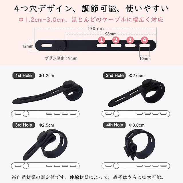 【取付簡単】4つのステップで、誰でも簡単に、ごちゃごちゃしたコードをスッキリ纏めることができます。一般的なシリコンバンドは長さ11~12cm、穴1~3つのものが多く、SONATUREは13CMと長めに、穴を4つに設定していることで、太いケーブルでも細いケーブルでも、柔軟に対応できるようになりました。