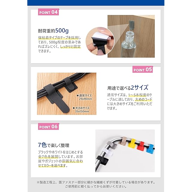 【マジックテープ式・複数本のケーブルも自在対応】マジックテープ仕様で、ケーブルの取り外しや再固定が簡単にできます。ループのサイズも自由に調整できるため、細いケーブルから複数本の整理にも対応できます。2サイズ展開で、用途に応じた使い分けも可能です