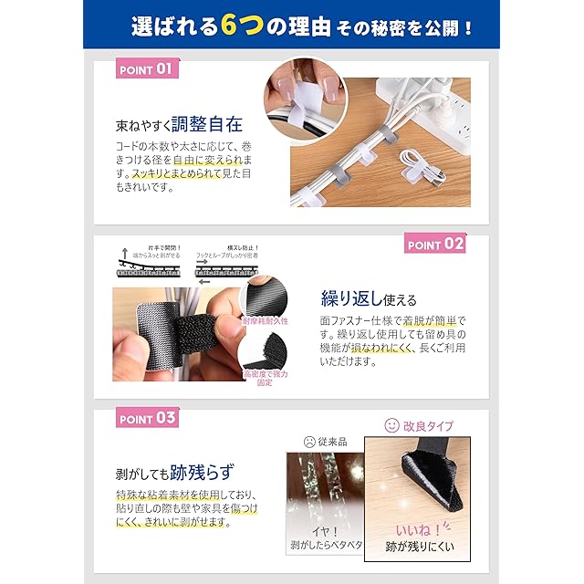 【配線収納大正解&ストレスゼロ】ごちゃごちゃになった配線をきちんとまとめることができ、フック面とループ面がしっかり噛み合い、散らばりにくくなります。日常生活の小さなイライラから解放され、快適な環境を手に入れ、ストレスなく作業や生活を送ることができます