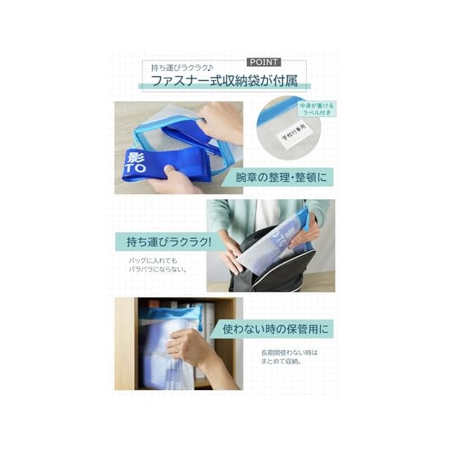 【未使用時の保管や持ち運びを考慮しました。】保管用の収納袋で腕章の整理も簡単にできます。 また収納袋は名札つきで中身がわかる仕様になっています。