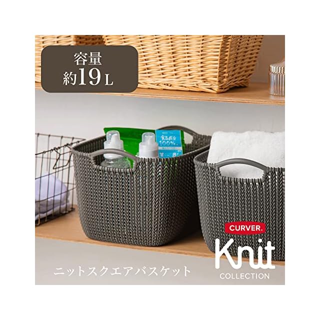 【使いやすい容量】19Lのスクエアバスケットは洗い分けの洗濯物入れとしてや、着替えやタオル、洗濯用品の収納、リビング、キッチン周りでのストックや小物収納など、グレイッシュなカラーとニットデザインがどんな部屋にも馴染むので、様々なシーンでマルチにお使いいただけます。