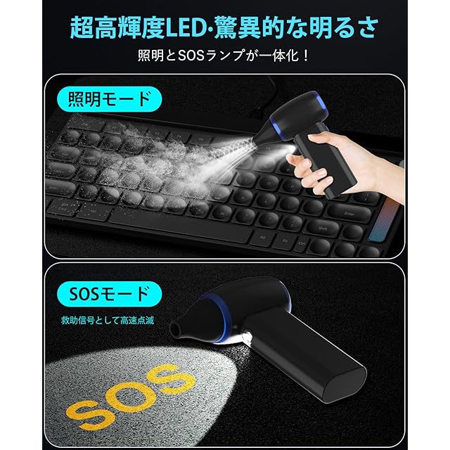 【超高輝度LED!清掃も照明もSOSライトもこれ一台】高輝度LEDチップと高性能材料を採用し、安価で実用的かつ耐久性に優れています。掃除から照明、手持ちライト、懐中電灯、防災ライトまで、この電動ダスターはまさに万能!ライトボタンを 1 回クリックすると、ライト モードが切り替わります。 ➀照明モード:掃除中に暗い隅や狭い隙間を照らし、手持ちライト、懐中電灯、災害用ライト、キャンプ用ライトとしても使えます。停電や緊急時はもちろん、アウトドアにも最適です。 ②SOSモード: 万が一、救助が必要な際に懐中電灯やフラッシュライトを使用して救助を呼ぶ場合、この点滅パターンで明確に救助の意思表示を行うことができます。