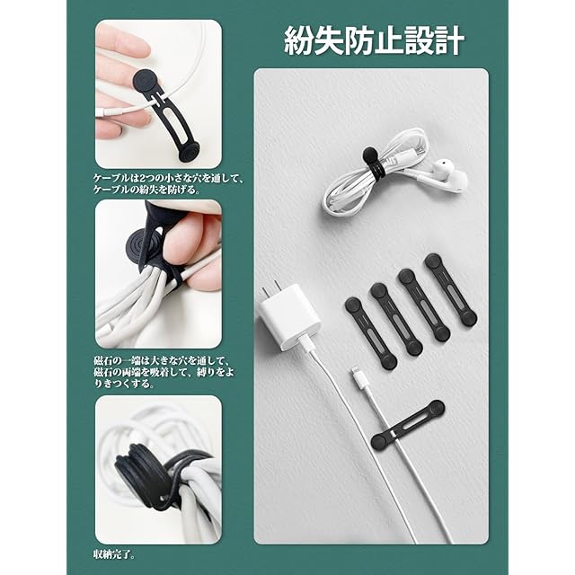 【紛失防止設計】磁石で止めるので細いケーブルを簡単に整理可能。 本体は3つの穴があり、操作が簡単でケーブルの紛失を防げます。まず、ケーブルは2つの小さな穴を通して、ケーブルを束ねます。磁石の一端は大きな穴を通して、磁石の両端を吸着して、縛りをよりきつくします。太いコードでも細いコードでも使用でき、より良い安定性や便利性を提供し【紛失防止設計】磁石で止めるので細いケーブルを簡単に整理可能。 本体は3つの穴があり、操作が簡単でケーブルの紛失を防げます。まず、ケーブルは2つの小さな穴を通して、ケーブルを束ねます。磁石の一端は大きな穴を通して、磁石の両端を吸着して、縛りをよりきつくします。太いコードでも細いコードでも使用でき、より良い安定性や便利性を提供し、使用範囲が広く、冷蔵庫、黒板、ホワイトボードなどに使えます。 、使用範囲が広く、冷蔵庫、黒板、ホワイトボードなどに使えます。