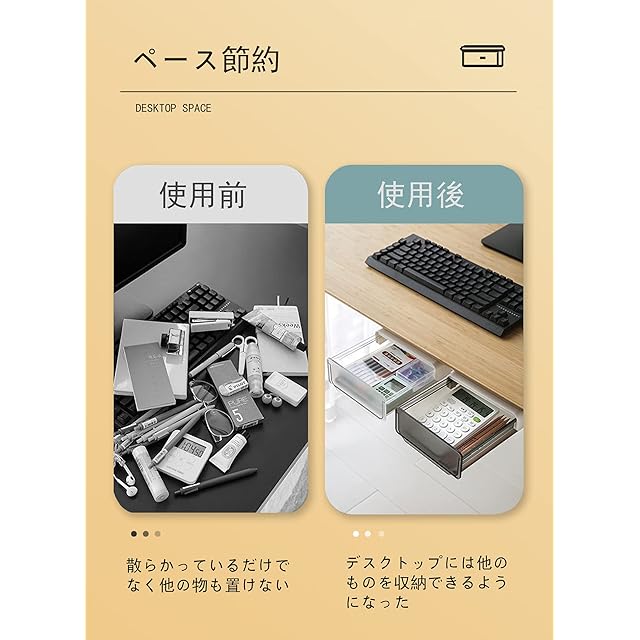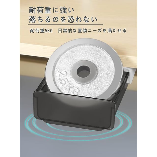 【設置簡単】工具は不要で、設置も簡単です。設置する前に設置する場所をきれいにし、両面テープを剥がして引き出し式収納箱を貼り付けるだけ完了です。スライド式の収納ボックスなので、サッと取り出しができます。両面テープの粘着力を確保するため、設置完了後24時間放置してからご使用ください。(写真付きの取扱説明書も同梱)。