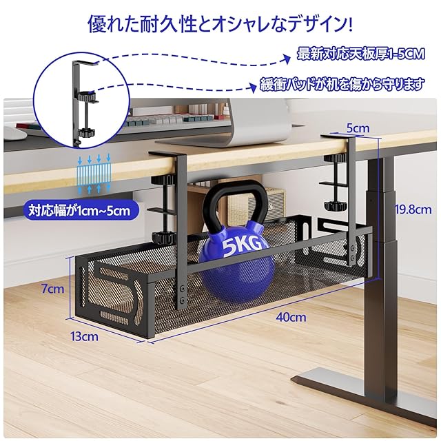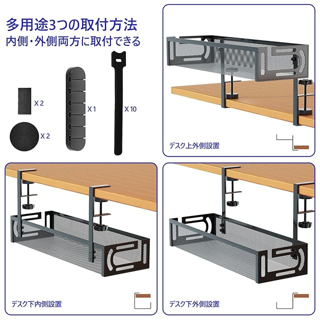 【穴あけ不要、頑丈耐久】:穴あけ不要で、クランプを締めるだけで、厚さ1-5CMの机の天板にしっかりと固定でき、簡単かつ迅速な設置が可能です。穴あけや接着剤なしで、天板を損傷することなく、跡を残さずに簡単に取り付けができます。事務所の掃除、ケーブル収納と配線 整理が簡単になります。文房具用品、小物収納、机 収納、机下 収納、リモコンなど、さまざまな小物を収納できる優れた万能収納箱であります。デスクした収納は必要に応じて場所を簡単に変更でき、特に賃貸の方や頻繁に引っ越しをする人に適しています。