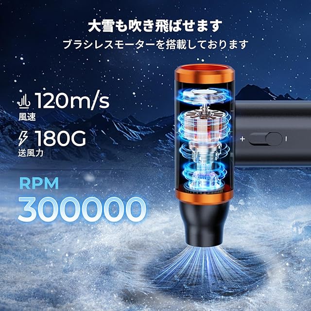 【超強力&無段階速度調節】この電動エアダスターは革新なブラシレスモーターを採用しており、300000RPM回転速度、130g送風力、120m/s風速を実現します。強力かつ安定した「暴風」を瞬時に発生し、ホコリや落ち葉、雪などの汚れを簡単に掃除出来ます。同時に、高いエネルギー変換効率なので、発熱しにくく、ブラシ付きモーターに比べて騒音も比較的小さくなります。更に、使用場所によってお好みの風量強さがスムーズに調整出来る無段階速度調整モードです。