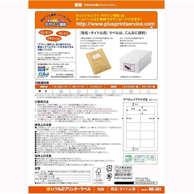 プラス ラベルシール いつものラベル FSC認証紙 10面 100枚 ME-501T 48-635