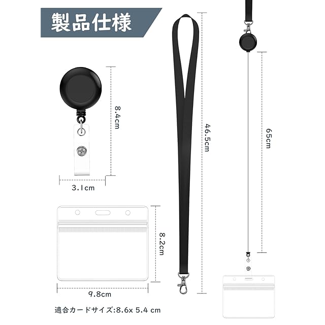 【仕様】名札ホルダーサイズ:11.2x6.4cm。適合カードサイズ:8.6x5.4 cm。ネックストラップの長さ:約45cm。リール伸びる長さ:約65cm。タイプ:縦型。防水機能も備えており、液体や汚れがついても簡単に拭き取れます。