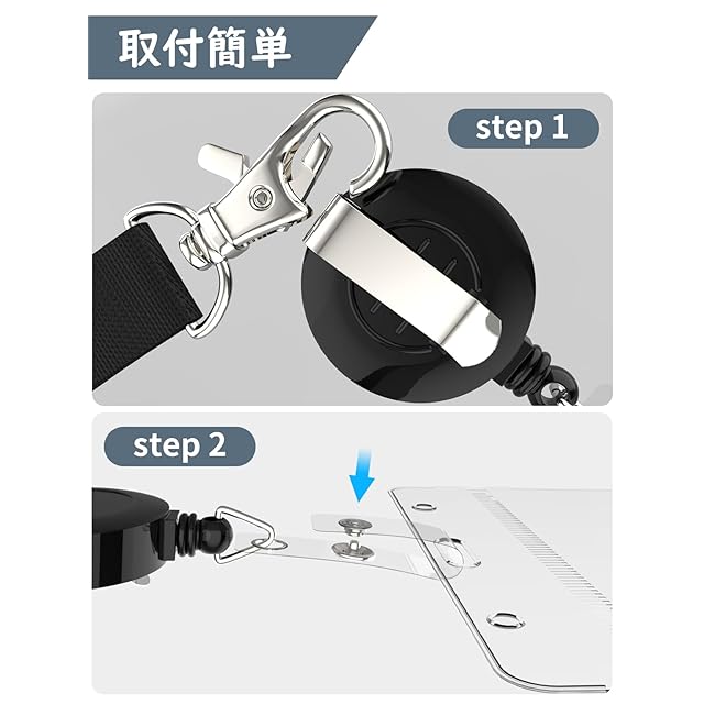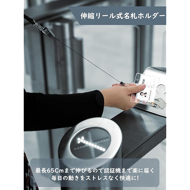 【リール式吊り下げ名札】伸縮可能なリール式ストラップが付いており、最大で65cmまで伸ばせます。これにより、社員証やスイカ、定期券などを取り出さずに読み取ることができ、非常に便利です。