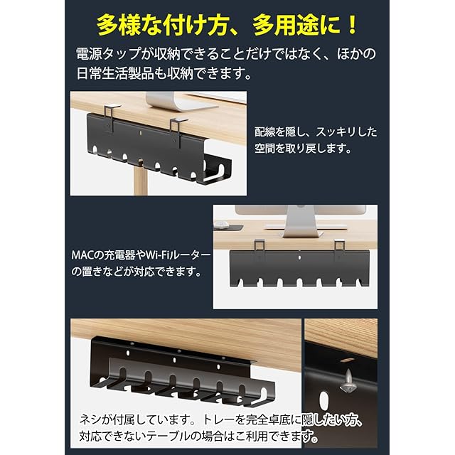 【多用途&二つの取付け方法】サイズ:幅43×奥行10×高さ10cm、天板の厚さは1~30mm対応できます。電源タップが収納できることだけではなく、ほかの日常生活製品も収納できます。MACの充電器やWi-Fiルーターの置きなども対応できます。オフィス環境と家庭環境を改善し、作業効率を高め、生活の質を向上させます!ネジが付属しています。 トレーを卓底に隠したい方、 対応できないテーブルの場合はご利用できます。