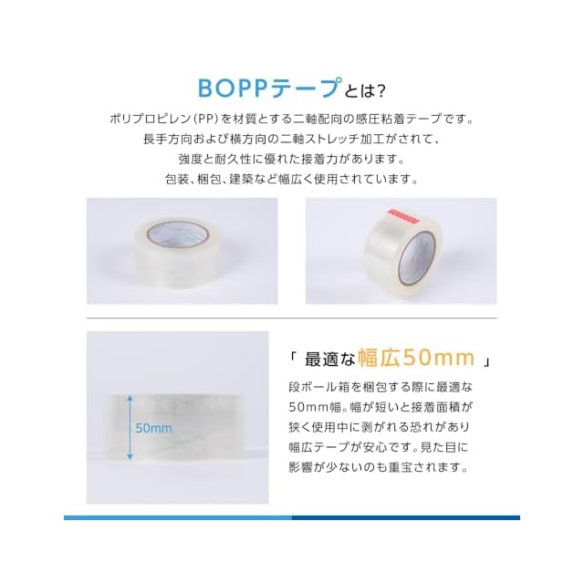 ポリプロピレン(PP)を材質とする二軸配向の感圧粘着テープです。長手方向および横方向の二軸ストレッチ加工がされて、強度と耐久性に優れた接着力があります。包装、梱包、建築など幅広く使用されています。
