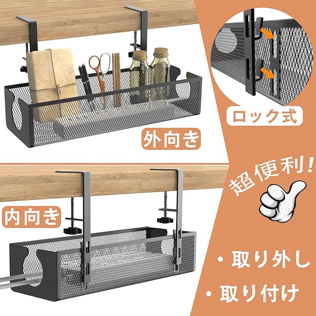 1【ロック式・二重構造】2024年の新発売のロック式のケーブルトレーなので、ネジ不要、組立不要、簡単に取り付け/取り外し可能です。クランプ固定式でデスクに取り付けできるケーブル配線トレーです。テーブルを傷つけずに天板に固定できるの調整可能ねじをカスタマイズしました。デスクの天板を挟むことで底部のハンドルを回して簡単に設置できます。どんな机でも付けることができます。