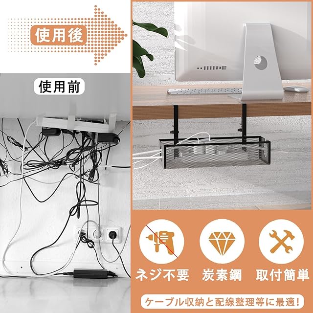 2【綺麗に収納・省スペース】ケーブル配線を効果的に整理し、プラグやルーターなどの機器をデスクの下に収納することで、デスクをより効率的にご利用いただけます。テーブルの前に置いてイヤホン充電ケーブルなどの小物を収納したり、キャビネットの下の調味料収納ラックとして使用したりできます。事務所の掃除、ケーブル収納と配線整理が簡単になります。