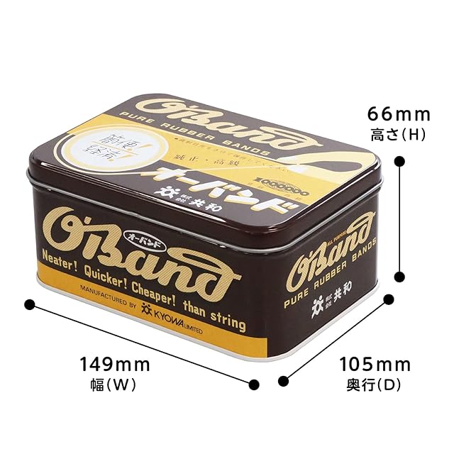 缶サイズ (幅×奥行×高さ) :14.9cm×10.5cm×6.6cm 輪ゴムサイズ:#18(内径44.5mm,折径70mm)×幅3mm