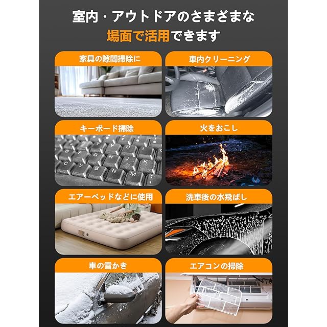 【最大風速56m/秒以上のパワフルブロワー】従来の拭き掃除や雑巾がけの常識を覆すパワフルな電動エアダスターの心臓部は、毎分11万回転の高速モーターと13個の合金ファンで、110gの圧倒的な風圧と爆風級の風量を生み出し、最大風速は従来の電動ダスターの10~15倍となる毎秒56m以上。車のボンネットに積もった雪や庭の落ち葉を瞬時に吹き飛ばすことができる。掃除だけでなく、エアマットレスの膨張、バーベキューの開始、ペットの毛の乾燥、ペンキの乾燥など、エアダスターの用途は幅広い。