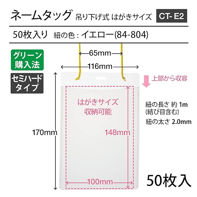 【名札部外形寸法】W116×H170mm 【適応カード寸法】W100×H148mm(はがきサイズ) 【紐の長さ・太さ】長さ=約1m(結び目含む)、太さ=2mm