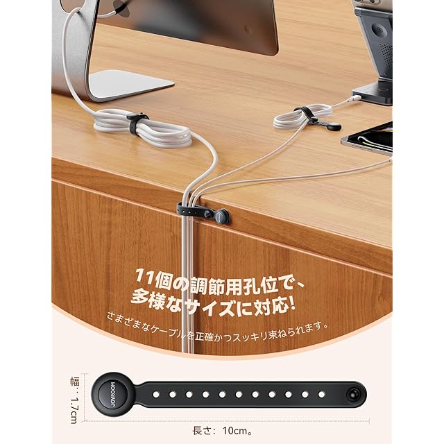 【ほぼ全ての電線に対応!11個のスナップホール設計】弊社のケーブルシリコンバンドには11個のスナップホールを採用し、ケーブルの太さに合わせて簡単に調整可能。巻き付けて使うことで、捆束する幅を精密に設定でき、スマホ充電ケーブルやイヤホンコードなどの細いものから、パソコンの電源コードのような太いものまで幅広く対応します。
