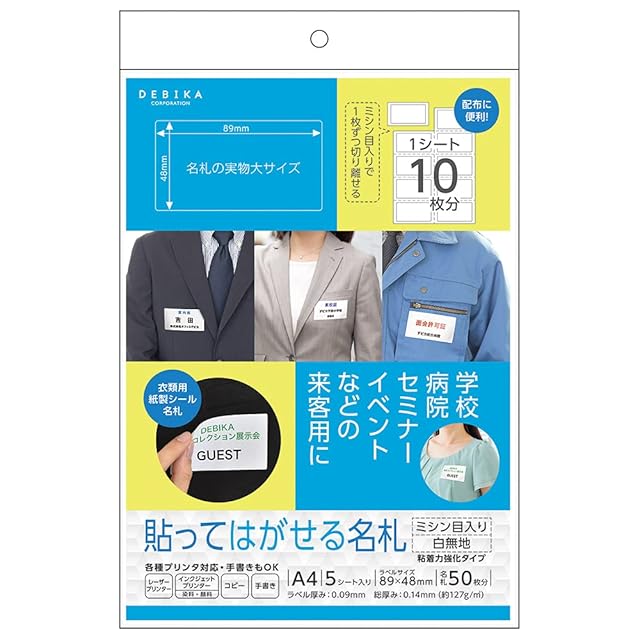 【仕様】名札50枚分・A4サイズ5シート(テストプリント用紙付き)、名札サイズW89×H48mm